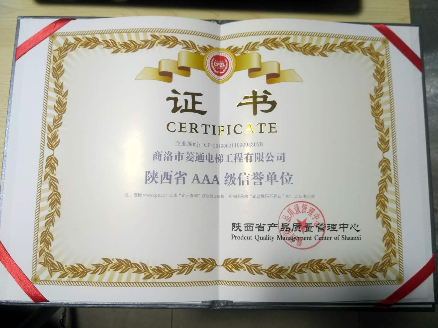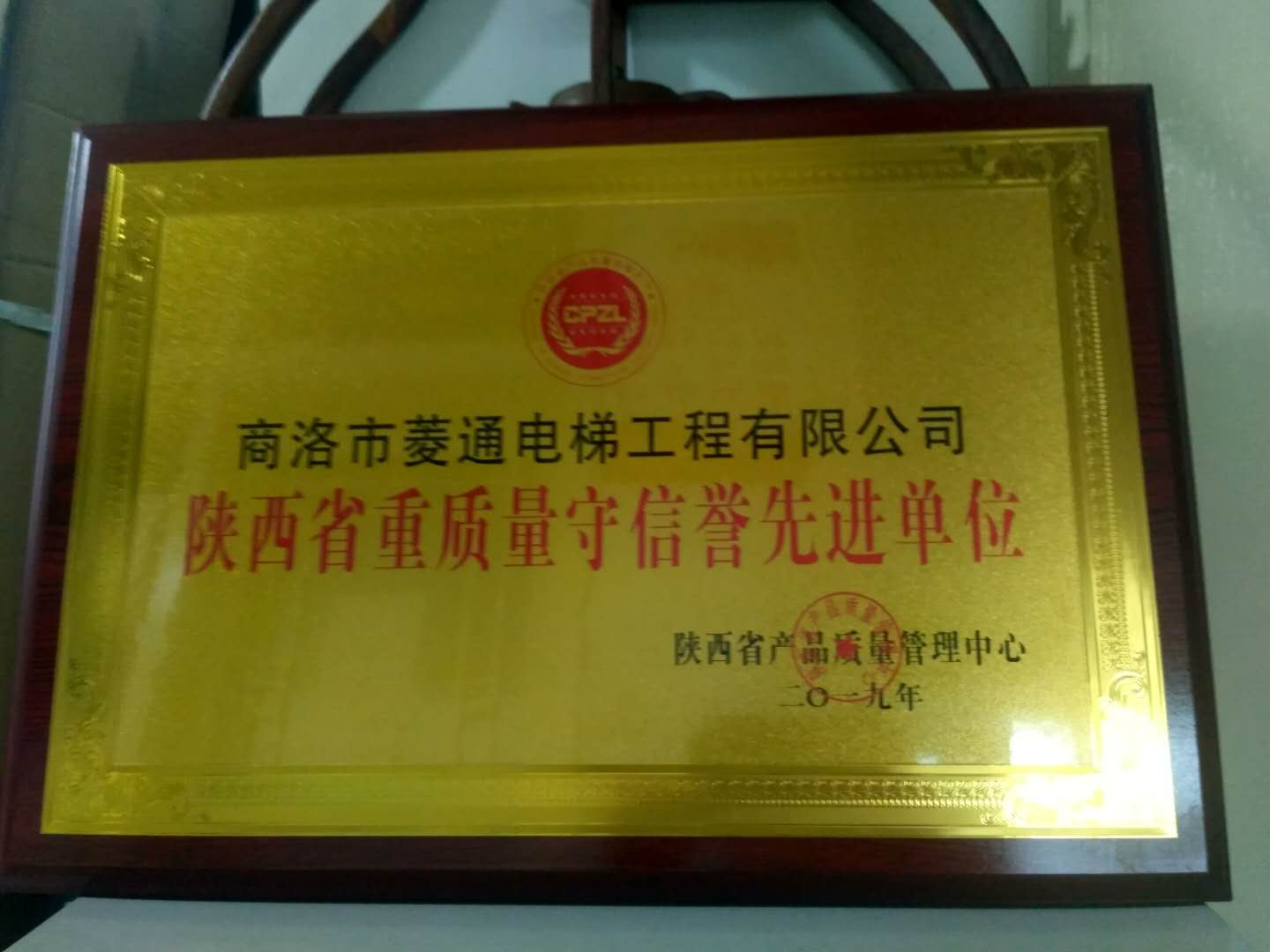 商洛菱通電梯工程有限公司,2019年很榮幸被陜西省產(chǎn)品質(zhì)量管理中心評為:陜西省AAA級信譽(yù)單位和陜西省重質(zhì)量守信譽(yù)先進(jìn)單位;并頒發(fā)獎牌及榮譽(yù)證書。這個榮譽(yù)不但得益于各單位的支持與默契合作,更得益于我公司優(yōu)良的團(tuán)隊(duì)氛圍和集體上下一致積極認(rèn)真的工作態(tài)度。更得益于領(lǐng)導(dǎo)重承諾守信譽(yù):提倡安全第一,質(zhì)量第一,信譽(yù)第一的原則。能被評為3A級信譽(yù)單位和信譽(yù)先進(jìn)單位,既是對公司工作的肯定,也是對今后工作做得更好的一種鼓勵,我公司定會盡職盡責(zé)做得更好。